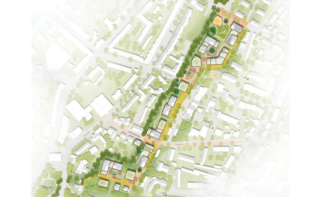 Das städtebauliche Konzept setzt neue Impulse für den Pottacker in Hattingen. Es entstehen zwei freiräumlich geprägte Achsen in dessen Mitte der Städtebau eingefasst wird. Das westliche Bestandsgrün bleibt als „Grüner Rücken“ erhalten, wird angereichert und zu einem weitestgehend nutzungsfreien „StadtNatur“-Band ausgebildet. Die Achse „Urbanes Leben“ gibt dem Quartier eine Adresse und übernimmt die Erschließungsfunktion. Städtebaulich werden die westlich gelegenen Bestands-Baufelder arrondiert. Die neue Bebauung schafft zur östlich gelegenen Bebauung eine klare Kante, ein „Gesicht“. Am Kreuzungspunkt der urbanen Achse und der Oststraße entsteht ein neuer Quartiersplatz. Dieser ist mit Spielplatz und mit Aufenthaltsmöglichkeiten ein Treffpunkt für die ganze Nachbarschaft.