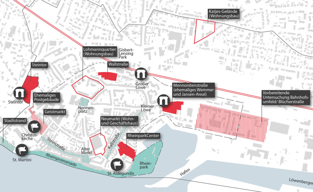 Die umfassende Stadtraumanalyse zeigt eine Innenstadt mit großen Potenzialen, aber auch deutlichen strukturellen und funktionalen Defiziten. Historische Gebäude, die Rheinpromenade und gelungene Neubauprojekte prägen viele Bereiche positiv, während Leerstände, ungenutzte Flächen, städtebauliche Barrieren und ungeordnete Stadteingänge an anderer Stelle das Stadtbild schwächen. Die Analyse macht deutlich, dass die Innenstadt stärker miteinander vernetzt werden muss – räumlich, funktional und gestalterisch. Es fehlt an attraktiven und grünen Aufenthaltsorten, an durchgängigen Wegeverbindungen und an sicheren, gut gestalteten Zugängen vom Bahnhof in die Innenstadt. Zudem sind zentrale Straßenzüge wie die Steinstraße oder Bereiche der Kaßstraße durch Leerstand, geringe Aufenthaltsqualität und mangelnde Begrünung geprägt. Gleichzeitig zeigt die Bestandsaufnahme, dass bereits vorhandenes urbanes Grün – insbesondere entlang der Rheinpromenade – wichtige Anknüpfungspunkte bietet, auf denen weiter aufgebaut werden kann. Insgesamt bestätigt die Stadtraumanalyse den klaren Bedarf, Städtebau, Freiraum und Mobilität stärker zu verzahnen und die Innenstadt als zusammenhängenden, attraktiven Stadtraum neu zu ordnen.