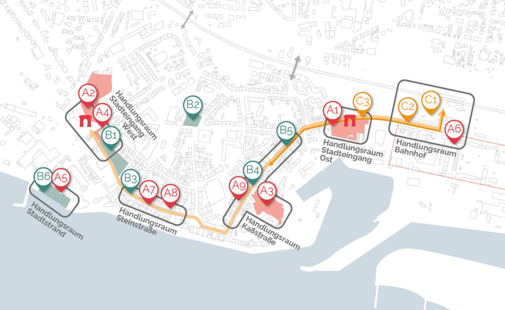 Das Handlungs- und Maßnahmenkonzept überführt die strategischen Zielsetzungen des Leitbilds in konkrete Projekte, die die räumliche, funktionale und gestalterische Weiterentwicklung der Innenstadt in den kommenden zehn Jahren prägen werden. Grundlage sind 32 Maßnahmen, die von der Aufwertung öffentlicher Räume über Wohnraumentwicklung und die Reaktivierung leerstehender Immobilien bis hin zu Mobilitäts- und Klimaanpassungsprojekten reichen. Ein besonderer Fokus liegt auf Impulsprojekten, die früh sichtbare Verbesserungen schaffen – etwa die Umnutzung des Alten Postgebäudes zu einem sozialen und kulturellen Zentrum, die gestalterische Erneuerung der Kaßstraße, die Schaffung eines neuen Durchgangs zwischen Kaßstraße und Neumarkt oder die Aktivierung privater Investitionen durch einen kommunalen Verfügungsfonds. Die Maßnahmen sind so strukturiert, dass sie sowohl kurzfristige Ergebnisse ermöglichen als auch langfristige Entwicklungen vorbereiten. Sie schaffen neue Wegeverbindungen, stärken zentrale Handels- und Aufenthaltsbereiche, verbessern das Stadtgrün, fördern innovative Wohnformen und setzen wichtige Impulse für eine nachhaltige Mobilität. Zusammen bilden sie einen aufeinander abgestimmten Maßnahmenkatalog, der die Innenstadt in ihrer Gesamtheit stärkt und lebendig, vielfältig und zukunftsfähig weiterentwickelt.