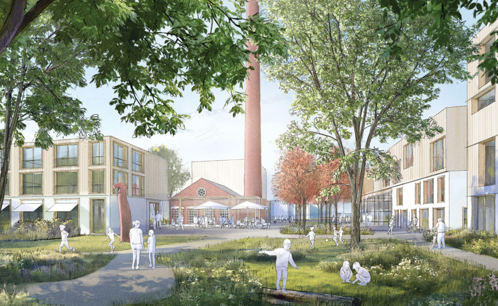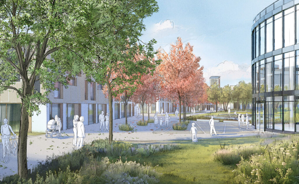 Es entsteht ein klar gefasstes und von öffentlichen Räumen durchzogenes Quartier, dass sich aus unterschiedlichen Nutzungsbausteinen zusammensetzt. Das nördliche Teilquartier auf dem Ara-Gelände ist mit einer Durchmischung von Gewerbe-, Büro- und Handwerksangeboten und verschiedenen Wohnformen geplant. Die Teilfläche südlich Zur Schlenkhecke sieht Wohnungen für ein breites Spektrum an Bewohnenden vor. Zusammen entsteht ein buntes und inklusives Quartier, das durch seine Lebendigkeit und Offenheit zu den Nachbarschaften in der Umgebung Mehrwerte nach Innen und Außen schafft. Verbindendes Element ist der autofreie Wohnanger. Er wird von neuen Wohngebäuden gesäumt und durch ein Mischen von Wohnen und Arbeiten mit aktiven Erdgeschossnutzungen bespielt.