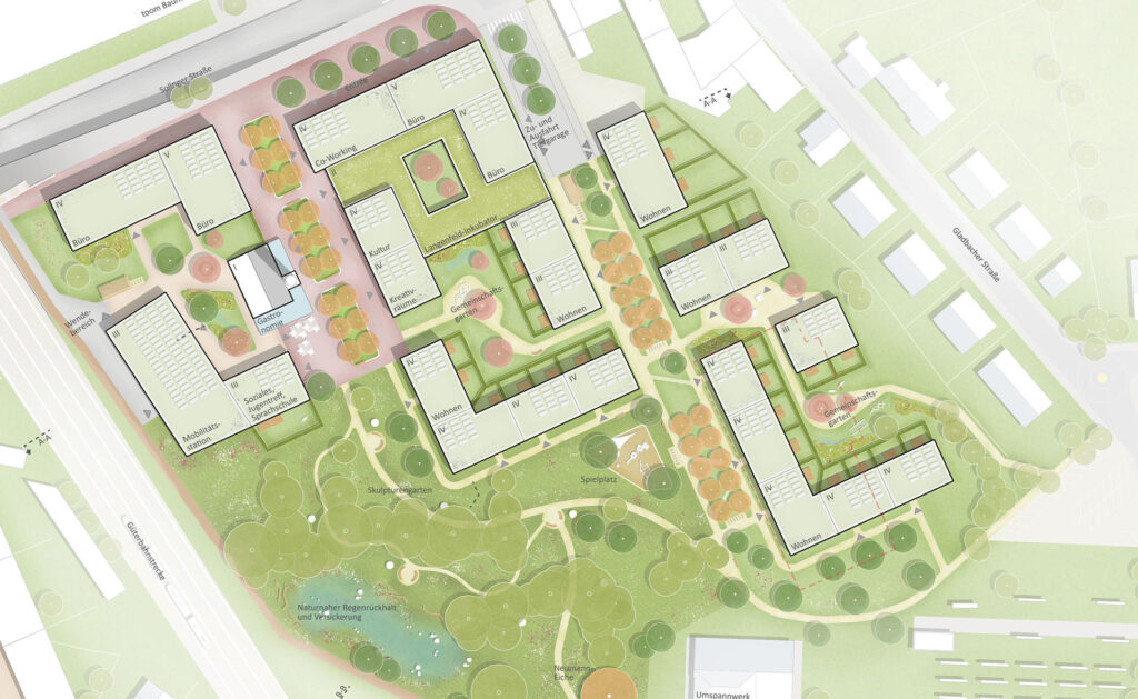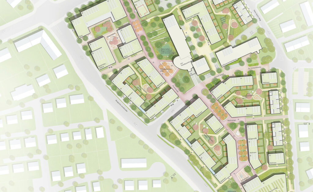 Die Baufelder sind zum Wohnanger ausgerichtet und entfalten hier ihre Adressbildung. So entstehen in den Wohnblöcken ruhige nutzbare Freiräume, die auf kleinmaßstäblicher Ebene das nachbarschaftliche Zusammenleben prägen und wichtige Funktion im Quartiersgefüge übernehmen. Es wird ein Mix sehr unterschiedlicher Typologien vorgesehen mit dem Reihenhaus als kleinster Einheit, gefolgt von Mehrgenerationenhäusern in unterschiedlichen Konfigurationen und Geschosswohnungsbauten. In allen Typen kann und soll geförderter Wohnraum entstehen. Eine höchstmögliche Mischung von Bauherrenschaften, Genossenschaften und Bewohnenden ist das Ziel.