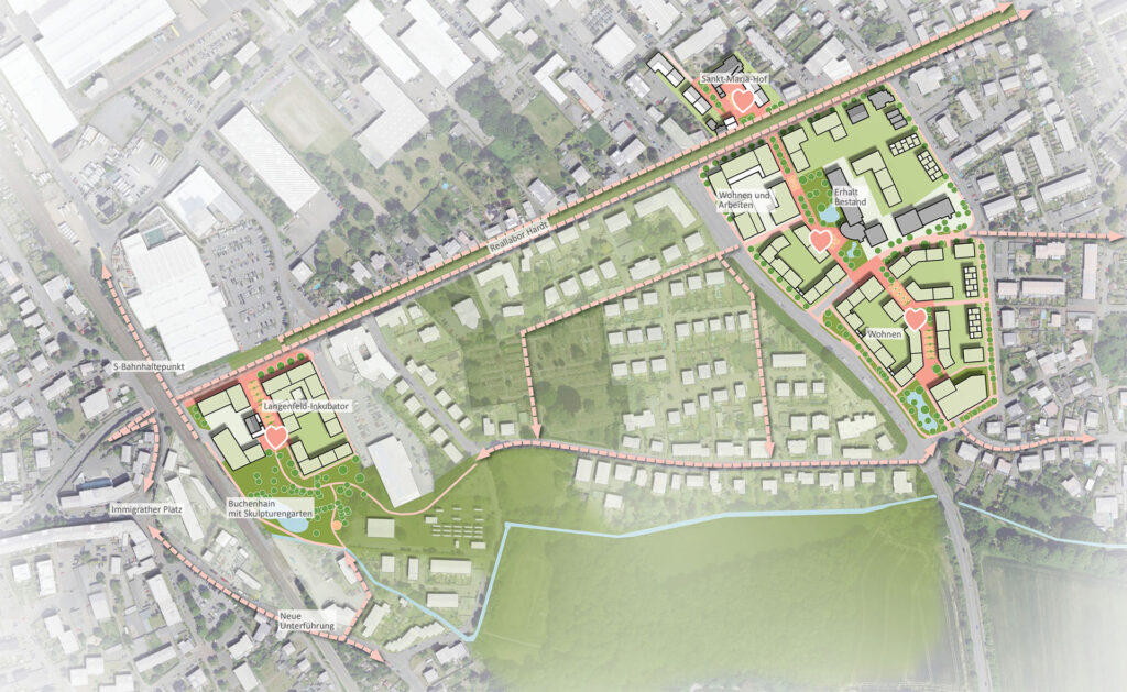 Ziel der städtebaulich-freiraumplanerischen Gesamtstrategie ist es, zwei einzigartige, flexibel nutzbare und nachhaltige Standorte mit Strahlkraft für Immigrath und Langenfeld zu entwickeln. Für die Plangebiete bedeutet dies, dass die bestehenden Siedlungsbereiche arrondiert und die baulich gewachsenen Übergänge zwischen Wohnen und Gewerbe durch Vielfalt und Nutzungsoffenheit neu definiert werden. Dabei wird Augenmerk auf die Weiterentwicklung der städtebaulichen Identität und die Implementierung der verträglichen langenfeldtypischen Nutzungsmischung für eine vielfältig zusammengesetzte Bewohner- und Nutzerschaft gelegt. Das Angebot von neuen qualitativ hochwertigen Baustrukturen und Freiräumen schafft einen deutlichen Mehrwert für die Menschen in Langenfeld. Es werden klar ablesbare Teilbereiche ausformuliert: der Langenfeld-Inkubator für Wohnen und Arbeiten auf dem ehemaligen Neumann & Büren-Gelände, Urbanes Wohnen und Arbeiten auf dem Ara-Gelände sowie eine klimaresiliente weiterentwickelte Hardt als verbindendes Element.