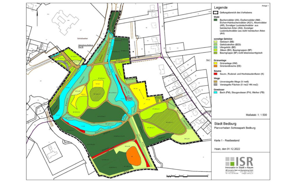 Der Schlosspark Bedburg ist inzwischen in die Jahre gekommen und stellt sich derzeit als verwilderte Grünanlage dar. Im Rahmen des integrierten städtebaulichen Entwicklungskonzeptes (ISEK) der Stadt Bedburg wurde daher die Umgestaltung des Schlossparks geplant. Hierfür wurde ein europaweiter landschaftsplanerischer Wettbewerb ausgelobt. Um die durch das Planvorhaben zur Umgestaltung des Schlossparks Bedburg entstehenden Eingriffe in Natur und Landschaft zu erfassen und diese auch ökologisch zu bewerten, wurde durch ISR ein Landschaftspflegerischer Fachbeitrag erstellt.