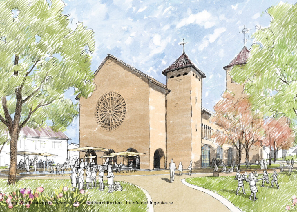 Baufeld 1: Der zentrale Bereich um die Kirche: grün, lebendig und mit Aufenthaltsqualität